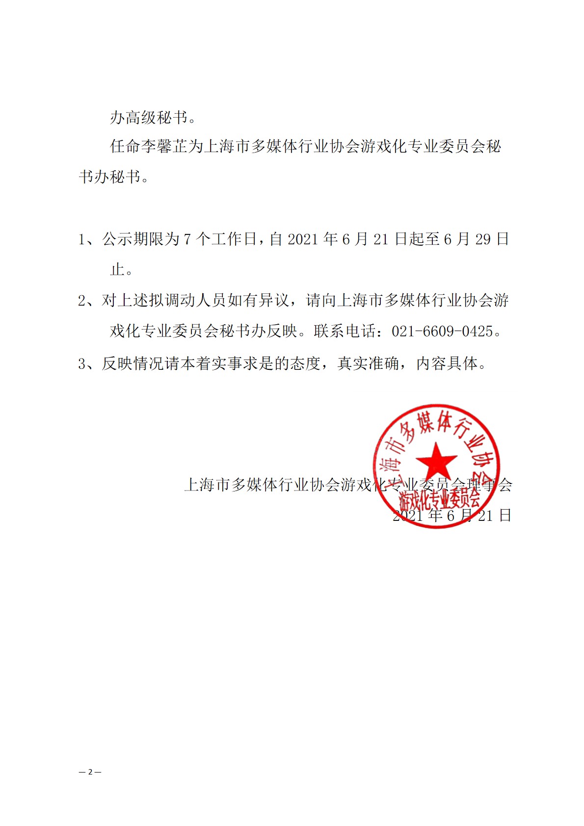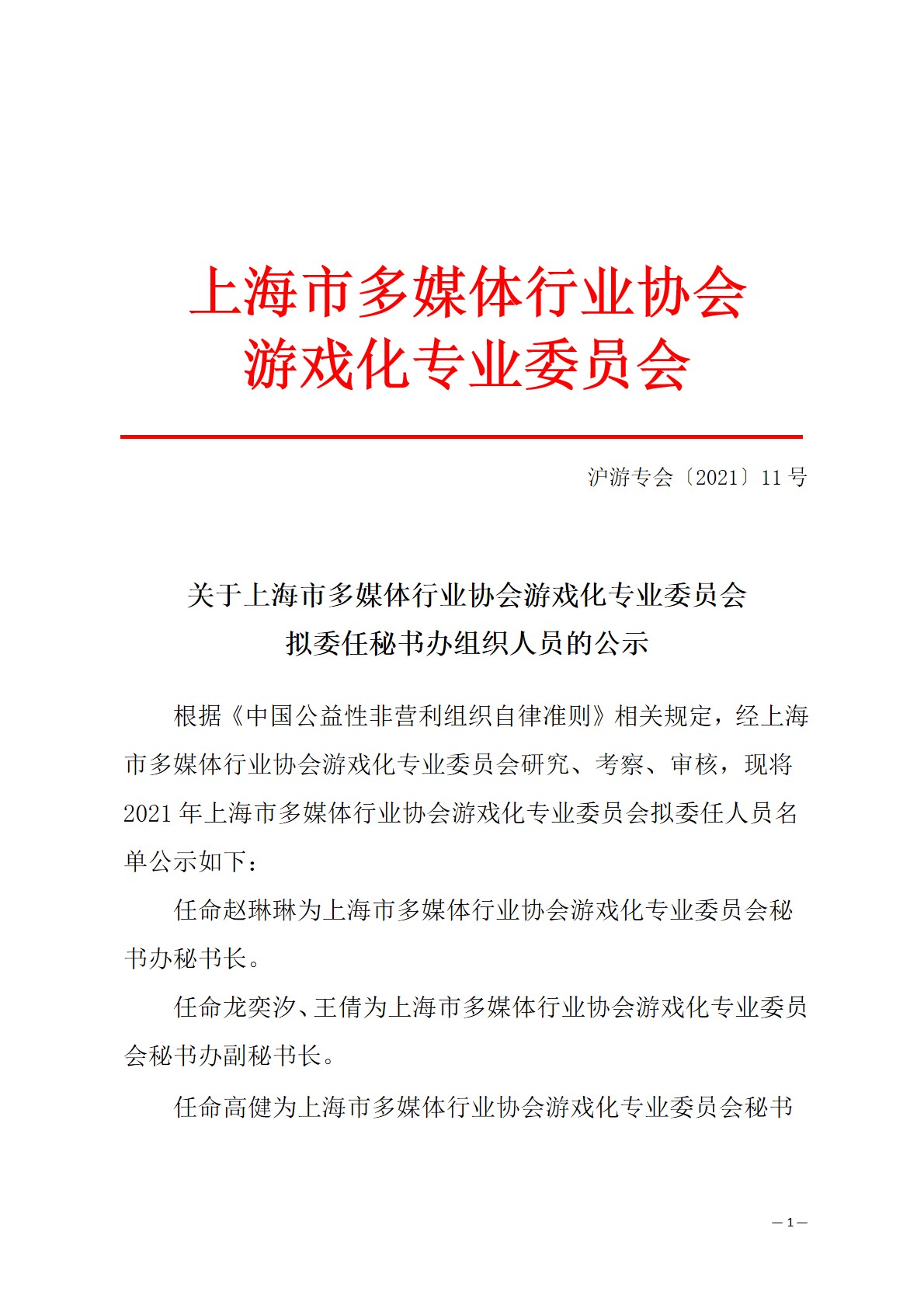 上海市多媒体行业协会游戏化专业委员会拟委任秘书办的公示