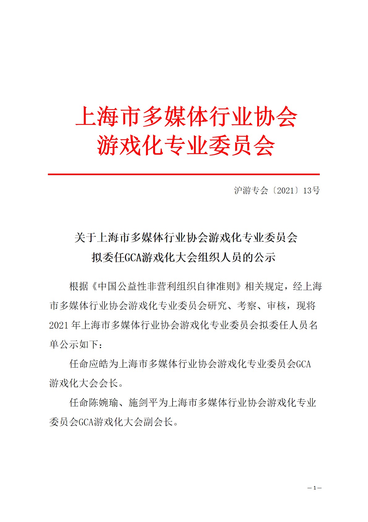 上海市多媒体行业协会游戏化专业委员会拟委任GCA游戏化大会的公示